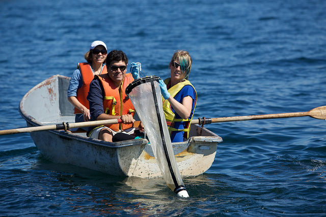 In the afternoon, the researchers (Monica Orellana, Allison Lee and Jake Valenzuela) took a row boat into the bay to collect water samples. Allison is using a mesh phytoplankton net that concentrates the organisms in a cup-like container.