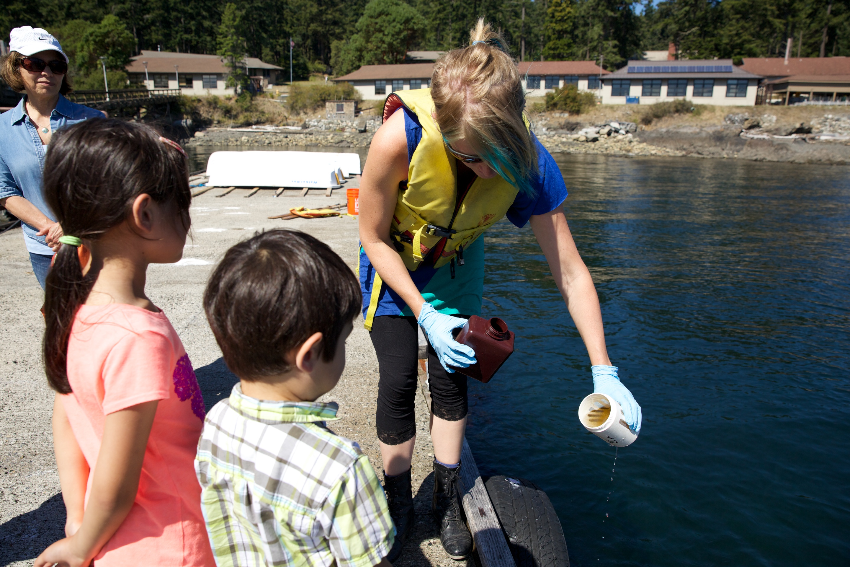 The kids got to peer into the microscope to see various phytoplankton, which are responsible for photosynthesis and play a key role in the food web in seawater and freshwater. There are hundreds of types of phytoplankton, but the the sample the kids got to see primarily contained Thalassiosira, Coscinodiscus, Chaetoceros, and Ditylum, as well as zooplankton and larvae (e.g. sea urchin, jelly fish). These organisms live in the waters just off the pier at the Friday Harbor Labs.