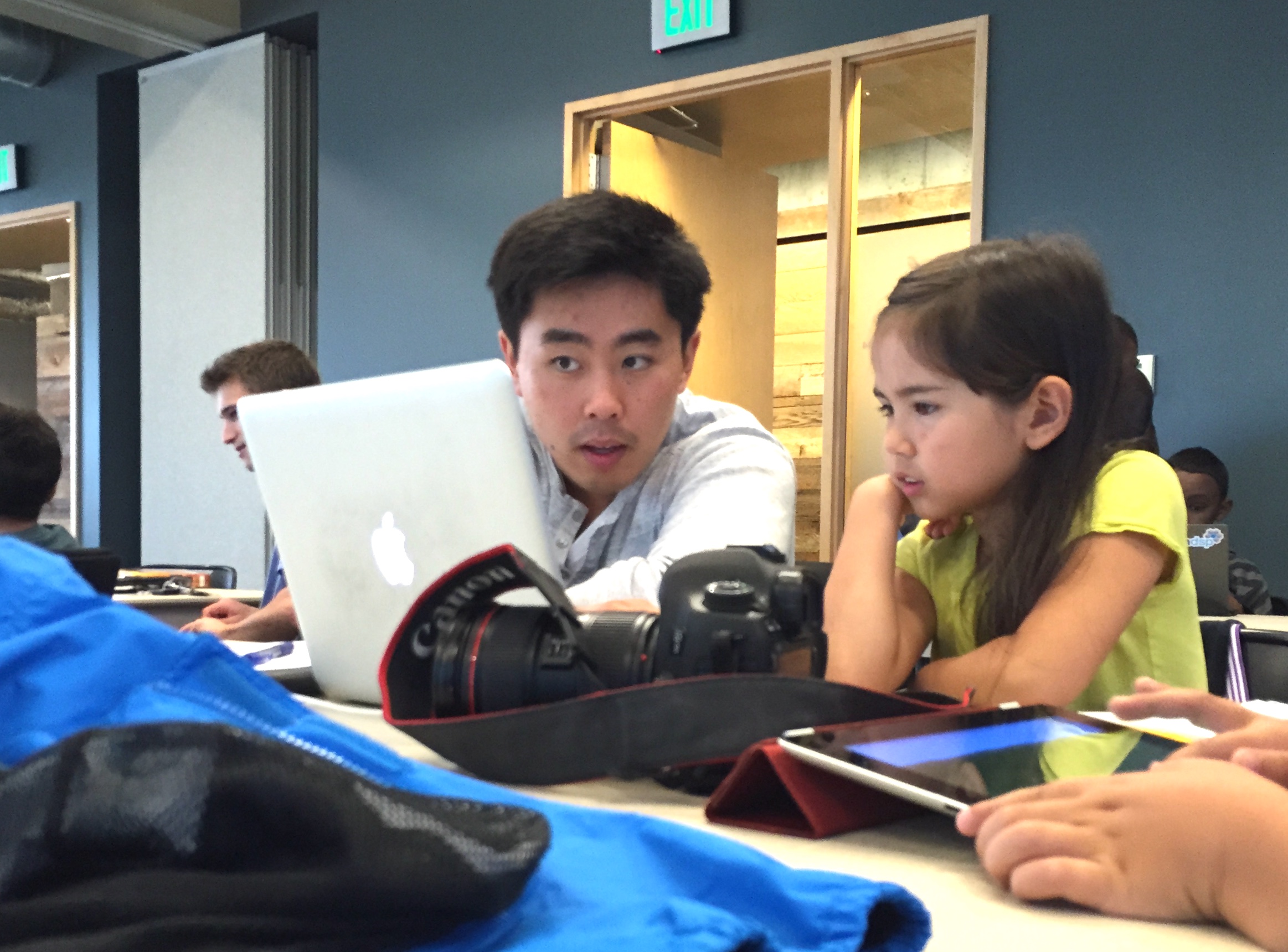 The kids who attend are divided up according to programming interest: Scratch, HTML/JavaScript, PHP, C# and Java. We found our way to the Scratch room and settled in, Meilee with my laptop and Shen with the iPad to keep him entertained. While Shen isn’t ready for Scratch, I wanted him to tag along so that he gets exposure to the club. The first 15 minutes or so of the session is spent listening to the lead mentor describe some basics of how to get started on the day’s assignment. CoderDojo has a set of projects that will help kids learn basic commands in Scratch. After the introduction, each participant can work at his/her own pace and seek help as needed from one of the volunteer mentors.