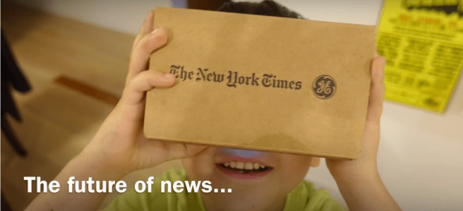 This morning’s New York Times came packaged with a cardboard box. Inside the sleeve was a virtual reality viewer – branded with The New York Times, GE and Google. Of course. It blows my mind to think about what kind of work went into creating this gee-whiz, deceptively simple experience. The kids immediately were curious about this box – which is called Google Cardboard.